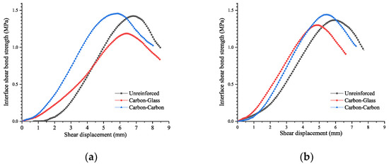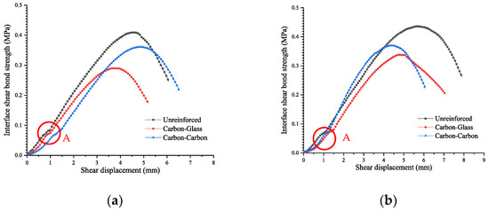 Interface shear strength vs. shear displacement curves in the oblique shear experiment. (a) AC-13C and (b) AC-20C.