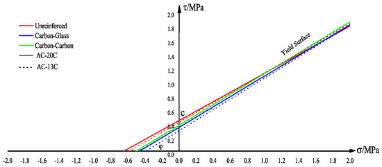 The direct shear test can be considered as an oblique shear test with a shear angle (α) of 90°. Then, normal stress , ; with assumed to be about 0.003, . The τ-σ graph is shown in Figure 10. It can be seen that with the normal stress increasing, the shear stress substantially converges to a certain value. It can be concluded that the geogrid-reinforced asphalt and unreinforced asphalt have the same interfacial bonding strengths under high normal stress, especially since the geogrid’s transverse and longitudinal ribs are made of the same material have the same stiffness. From the data shown in Figure 4, Figure 7, and Figure 9, the yield surface can be drawn in Figure 10. The values of φ are shown in Table 4. The friction angle of the reinforced asphalt is obviously higher than that for the unreinforced asphalt, which means that the mesh structure of the geogrid enhances the friction between asphalt layers.