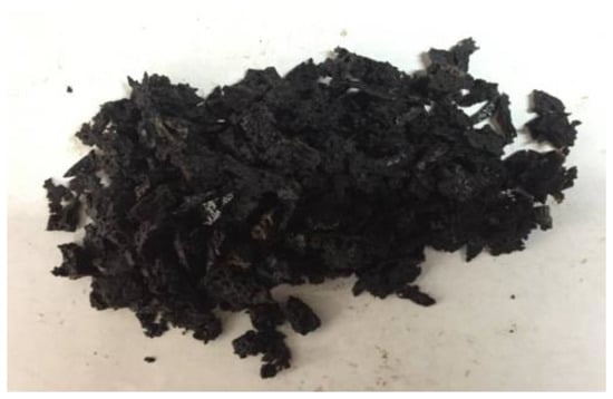 The GQDs/SBS modifier was prepared by the Pickering emulsion polymerization method. The preparation process is shown in Figure 1. Firstly, a certain mass of GQDs was dispersed into pure water, and a 5% (mass concentration) GQDs solution was gained through ultrasonic dispersion for 30 min. Meanwhile, SBS particles were dissolved into methylbenzene, and a 20 wt% (mass concentration) SBS methylbenzene solution was prepared. The SBS methylbenzene solution was added to the GQDs solution at a mass ratio of 1:1, and Pickering emulsion was acquired through 5 min high-speed shearing using a BME shearing machine under 4000 r/min. The Pickering emulsion was poured into a clean glass tray with a flat bottom. Finally, the tray was put in a vacuum drying box under 80 °C for 12 h. The Pickering emulsion developed auto polymerization under these conditions, thus obtaining a GQDs/SBS modifier. It can be seen from Figure 2 that the GQDs/SBS modifier is a black solid under room temperature.