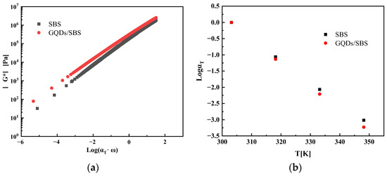 (a) Master curves for GQDs/SBS composite-modified asphalt and SBS-modified asphalt at the reference temperature of 30 °C and (b) Variations of the translocation factor with temperature.