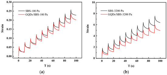 The strain responses of the GQDs/SBS composite-modified asphalt and SBS-modified asphalt after 10 cycles at 60 °C and two stress levels (100 Pa and 3200 Pa) are shown in Figure 11. For one creep–recovery cycle, the strain of the GQDs/SBS composite-modified asphalt at the end of the creep stage and its strain at the end of the recovery stage are smaller than those of SBS-modified asphalt, which are attributed to the added GQDs.
