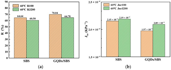 For the quantitative comparison of high-temperature performance between the GQDs/SBS composite-modified asphalt and SBS-modified asphalt, the parameters of R and Jnr of the two samples at 60 °C under two stress levels (100 Pa and 3200 Pa) are shown in Figure 12. With the addition of GQDs, R increases while Jnr decreases. Given the same conditions, the R of the GQDs/SBS composite-modified asphalt is higher than that of the SBS-modified asphalt, while Jnr is smaller. This implies that adding GQDs increases the high-temperature rutting resistance of asphalt. In addition, the R values of both the SBS-modified asphalt and GQDs/GQDs composite-modified asphalt decrease with the increase of stress. Meanwhile, the Jnr of the two samples increases to some extent. In a word, increasing vehicle loads may weaken the recoverable capacity of asphalt pavement significantly under high temperatures in summer, thus causing rutting damages.