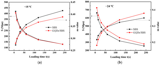 Evolution of S and m-value versus loading time for GQDs/SBS composite-modified asphalt and SBS-modified asphalt at (a) −18 and (b) −24 °C.