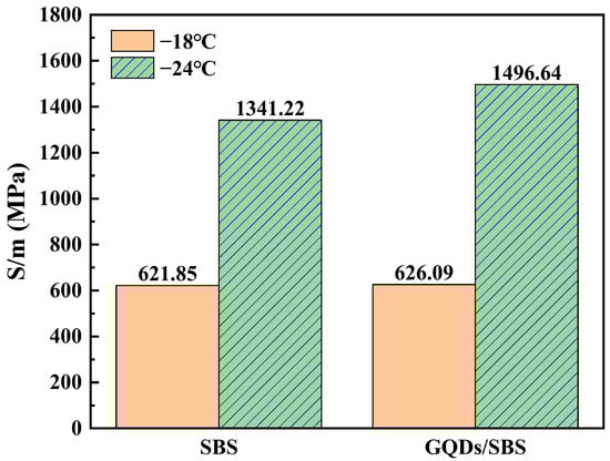 Variations of the S and m of the GQDs/SBS composite-modified asphalt and SBS-modified asphalt at −18 and −24 °C, which are measured by BBR with time, are shown in Figure 13. S drops quickly with the increase of loading time, while m increases significantly. The variable rates of S and m are different. Given the same loading time, the m of the GQDs/SBS composite-modified asphalt at −18 °C is smaller than that of SBS-modified asphalt. However, the m of the GQDs/SBS composite-modified asphalt at −24 °C is higher. S presents the opposite variation trend. To further compare the low-temperature performance of the GQDs/SBS composite-modified asphalt and SBS-modified asphalt, S/m at 60 s was used to characterize the low-temperature crack resistance of asphalt. The lower S/m indicates the stronger crack resistance of asphalt and better low-temperature performance. It can be seen from Figure 14 that given the same temperature, the S/m of the GQDs/SBS composite-modified asphalt is higher than that of the SBS-modified asphalt, indicating that the GQDs/SBS composite-modified asphalt has poor low-temperature crack resistance.