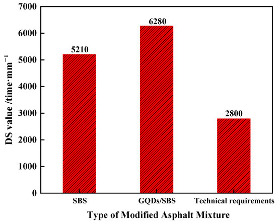 In the present study, the high-temperature stabilities of the SBS-modified asphalt mixture and the GQDs/SBS composite-modified asphalt mixture were evaluated by the dynamic stability in the high-temperature (60 °C) rutting test. The high-temperature stability test results are shown in Figure 15.
