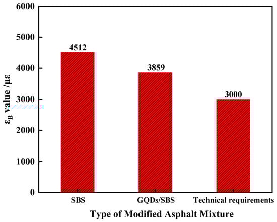 It can be seen from Figure 16 that the maximum bending strain of the GQDs/SBS composite-modified asphalt mixture at low-temperature failures is 14.5% lower than that of the SBS-modified asphalt mixture. However, all test results meet the standard requirements, indicating that adding GQDs decreases the tenacity and temperature sensitivity of the asphalt mixture under a low-temperature state. As a result, the low-temperature crack resistance declines accordingly.