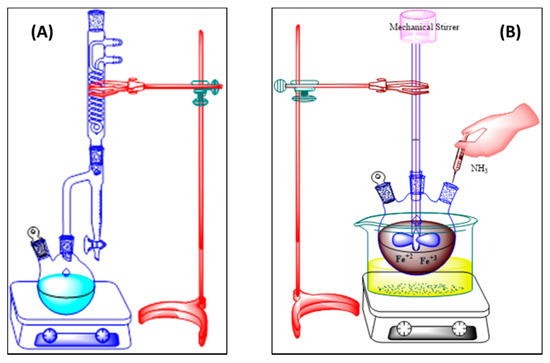 IONP was synthesized by combining ferrous and ferric chlorides at a 1:1.5 ratio. In 100 mL of deionized water, the salt mixture was dissolved, and ammonium hydroxide solution (3M) was added at a 5 mL/min rate until the pH reached 11. The mixture was continuously stirred at 600 rpm by using a mechanical stirrer, as shown in Figure 1B. The reaction mixture was kept at 80 °C for 90 min with continuous stirring. The product obtained was separated by using magnetic decantation, rinsed thoroughly with deionized water and ethanol. The black precipitates obtained were freeze dried to obtain a black powder of magnetite nanoparticles.