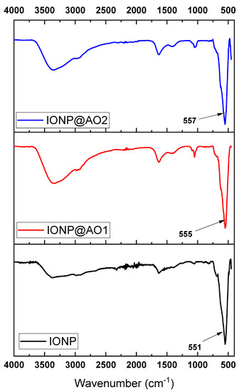 The FTIR spectra of IONP and IONP@AO are shown in Figure 3. Magnetite was observed in the nanoparticle samples, with a strong absorption at 551, 555, and 562 cm−1 for IONP, IONP@AO1, and IONP@AO2, respectively. The peak observed at 3100–3200 cm−1 is due to stretching vibration of −OH. The peak at 1621 cm−1 confirms the presence of carbonyl groups in both samples of IONP@AO [27].