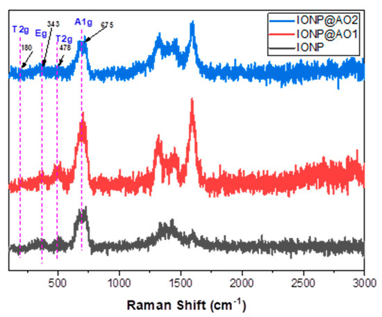 Spectra obtained from Raman analysis are presented in Figure 4. The main band at 671 cm−1 (A1g) verifies the presence of magnetite [28]. IONP@AO has a main band centered at 675 cm−1, and the peaks at ca. 478 cm−1 and 343 cm−1 are due to the A1g, T2g, and Eg vibration bands of magnetite. Moreover, no peaks were observed for maghemite in the Raman spectra of either functionalized or unfunctionalized IONP [29,30].
