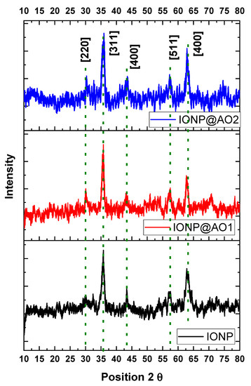 XRD spectra unfunctionalized IONP and functionalized IONP@AO.