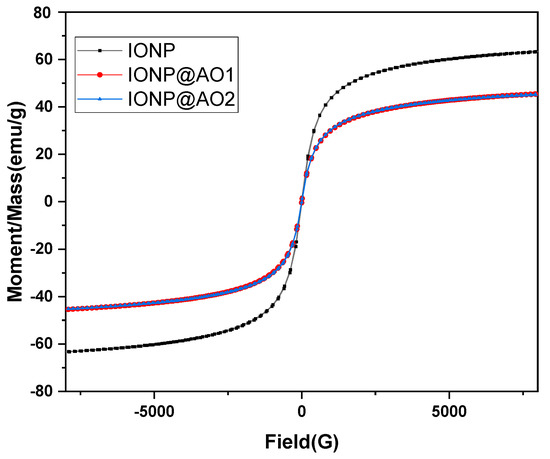 A vibrating sample magnetometer (VSM) was used to determine saturated mass magnetization. Values of 64.19 and 45 emu·g−1 (Table 1) were given for bare iron oxide nanoparticles and functionalized IONP@AO, respectively. Figure 6 displays the hysteresis loop as a function of the magnetic field at an ambient temperature. All samples showed superparamagnetic behavior, and their saturation magnetization was lower than magnetite in bulk (92 emu·g−1) [31]. Functionalized IONP@AO1 and IONP@AO2 saturation magnetization was reduced compared to unfunctionalized IONP, probably because of the presence of organic species on its surface [32,33,34].