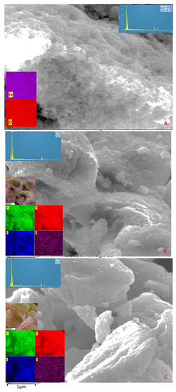 EDX of (A) IONP, (B) IONP@AO1, and (C) IONP@AO2.