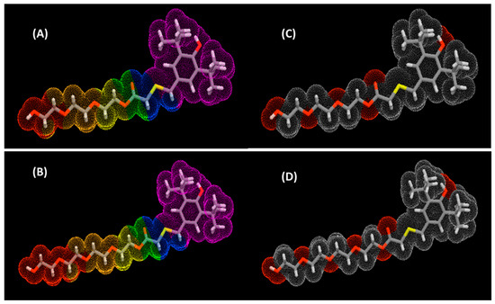 (A,B) Molecular lipophilicity potential (MLP); (C,D) polar surface area.