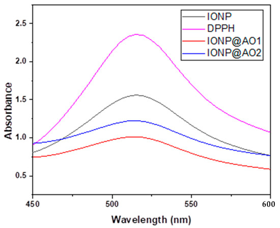 Various chemical-based techniques can be used to assess antioxidant activity. Either electron transfer or H atom transfer is used in these tests, depending on the outcome of the reaction. The ability of IONP@AO to scavenge free radicals was assessed using the DPPH test, which relies on electron transfer [24]. The antioxidant properties of nanoparticles were investigated using a modified DPPH assay [24,25]. Methanolic suspension of the sample (300 μL) and 1 mL of methanolic solution of DPPH (0.2 mM) were mixed in 1 cm quartz cuvettes. The readings were taken after thirty minutes. The absorbance was continuously observed at 517 nm. Each experiment was repeated twice. Every reading was noted after exactly 30 min of mixing with DPPH solution. The free radical scavenging capacity of the samples was calculated by using Equation (1):
