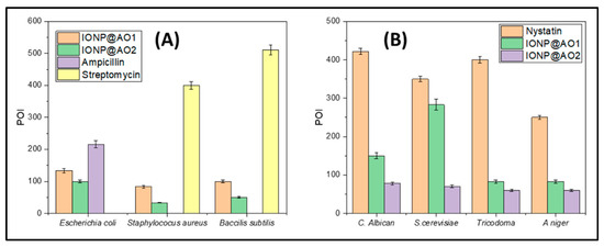 Percentage of inhibition (POI) of (A) bacterial growth and (B) fungal growth after treatment with IONP@AO.