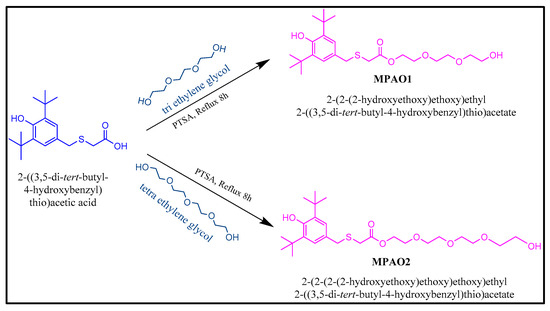 Triethylene glycol was added to a solution of 2-((3,5-di-tert-butyl-4-hydroxybenzyl)thio)acetic acid (2 g) in dry toluene (5 mL), p-Toluenesulfonic acid (PTSA) (0.02 g) was used as a catalyst. The reaction mixture was refluxed for 8 h, as shown in Figure 1A. Dean Stark apparatus was used to remove water produced during the reaction. The catalyst and unreacted materials were removed by filtration and then washed with distilled water. The mixture was dried by using anhydrous sodium sulphate. The precipitates obtained were filtered and dried at room temperature (RT) and recrystallized from the appropriate solvent.