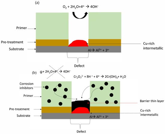 As mentioned previously, chromate inhibitive pigments were mostly used in the past. As reported by Snihirova et al., these pigments are very efficient against corrosion because they can inhibit corrosion in active areas [1]. Indeed, without chromate inhibitive pigments, the oxygen reaction reduction (ORR) quickly triggers coarse intermetallic particles (Al2Cu, Al2CuMg) leading to the attack of the intermetallic layer due to alkalinization in extreme conditions (see Figure 6a). However, in the presence of chromate, the cathodic inhibition involves the reduction of Cr(VI) to Cr(III), which adsorbs on the Cu-rich particles and suppresses the oxygen reduction reaction (see Figure 6b).