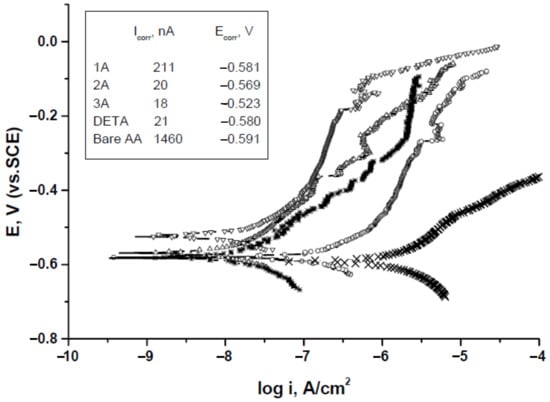 Potendiodynamic scans of 2024 T3 aluminum alloys where SNAP coatings were applied and prepared with several crosslinking agents (1A: 3-aminopropyltrimetoxysilane (○), 2A: 3-(2-aminoethyl)aminopropyltrimethoxysilane (∆), 3A: 3-(trimethoxysilyl) propyldiethylenetriamine (▽), DETA: diethylenetriamine (*)) and bare AA 2024 T3 (x). Reprinted with permission from Ref. [24]. Copyright 2003, Elsevier.