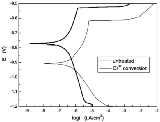 Polarization curves of the 6063 Al alloy without and with Cr3+ surface treatment in 3.5% NaCl solution at room temperature. Reprinted with permission from Ref. [30]. Copyright 2008, Elsevier.