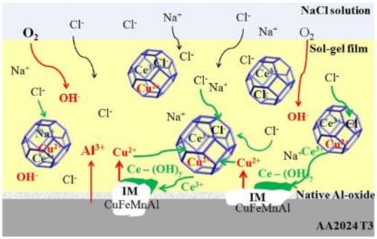 Epoxy silicate sol–gels containing different percentages of cerium salts (cerium (III) chloride, cerium (III) nitrate hexahydrate, and ammonium cerium (IV) nitrate) were investigated by Kasten et al. as coatings for the aluminum alloy AA 2024 T3 [42]. By X-ray Photoelectron Spectroscopy (XPS) and Electrochemical Impedance Spectroscopy (EIS), they noted that the addition of Cerium, whose oxidation state remains stable in sol–gel coatings, improved the corrosion protection of 2024-T3 aluminum alloys.
