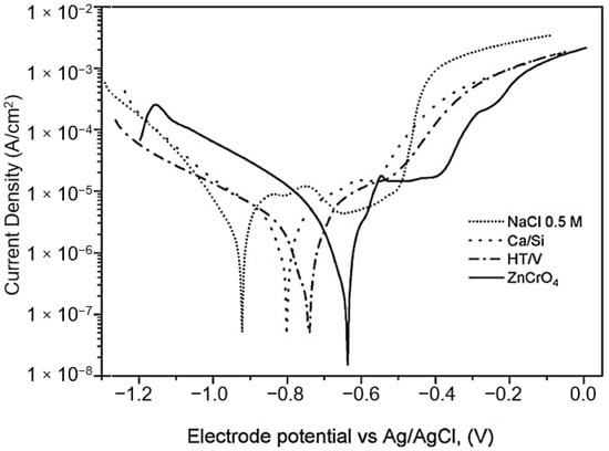 Yu et al. [30] noted the same results on AA 6063 aluminum alloys coated with a trivalent-chrome coating (KCr(SO4)2) in 3.5 wt% NaCl. They showed that the deposition of Cr3+ on the aluminum alloys decreased the corrosion current density and shifted the corrosion potential towards the more positive region, as shown in Figure 9.