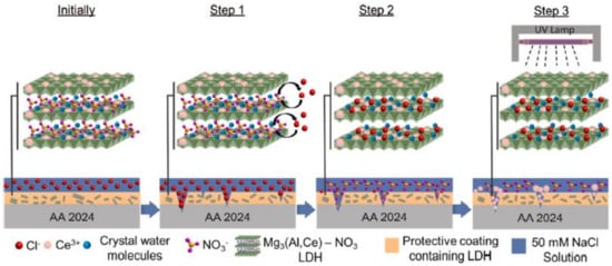 - Bouali, A.; Serdechnova, M.; Blawert, C.; Tedim, J.; Ferreira, M.; Zheludkevich, M. Layered double hydroxides (LDHs) as functional materials for the corrosion protection of aluminum alloys: A review. Appl. Mater. Today 2020, 21, 100857. [Google Scholar] [CrossRef]