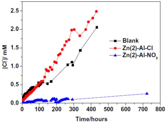 - Tedim, J.; Kuznetsova, A.; Salak, A.N.; Montemor, F.; Snihirova, D.; Pilz, M.; Zheludkevich, M.L.; Ferreira, M.G.S. Zn–Al layered double hydroxides as chloride nanotraps in active protective coatings. Corros. Sci. 2012, 55, 1–4. [Google Scholar] [CrossRef]