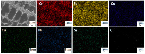 As aforementioned, SiC has decomposed into Si and C during the laser cladding process. The C would react with Cr in the high-entropy alloys to form Cr7C3. Hence, the second phase may be the Cr7C3. Figure 3 shows the EDS mapping of the CoCrFeNiCu(SiC)10 high-entropy alloy coatings. The high-entropy alloy components are distributed uniformly on the surface of the coatings, except the elements of Cr and C. These two elements are enriched in the position of the precipitated phase, indicating that it is composed of Cr and C elements. Combined with the results of XRD, it can be recognized that the precipitated phase is Cr7C3.