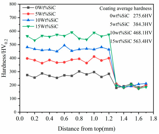 Figure 4 shows the hardness as a function of the depth of the 316L stainless steels with CoCrFeNiCu(SiC)x HEA coatings. As can be seen, the hardness of the coatings with different SiC contents are all higher than that of the substrate. The values of the Vickers microhardness is obtained on the cross-section of the CoCrFeNiCu(SiC)x HEA coatings. The corresponding average hardness is 275.6, 384.3, 468.1, and 563.4 HV of CoCrFeNiCu, CoCrFeNiCu(SiC)5, CoCrFeNiCu(SiC)10, and CoCrFeNiCu(SiC)15 HEA coatings. The hardness of substrate is only 186 HV, which is about 1/3 of the CoCrFeNiCu(SiC)15 HEA coating. For CoCrFeNiCu HEA coating, there is no SiC and the hardness increased due to the property of CoCrFeNiCu high-entropy alloys. Usually, the HEAs are composed of 5 or more 5 elements, the atomic radius of each principal element is different and randomly occupies the point of crystal lattice, leading to obvious solid solution strengthening effects. The dislocation movement and grain boundary sliding will become difficult. Hence, the hardness of CoCrFeNiCu HEA coating increased [28]. When adding SiC ceramic particles in the CoCrFeNiCu HEA, the particle strengthening effect is also introduced. The SiC particles pin on the dislocations and grain boundaries to prevent plastic deformation and grain growth, resulting in the hardness increasing [29]. Especially for this work, a part of SiC has decomposed into Si and C during the laser cladding process, with a new compound of Cr7C3 formed. The Cr7C3 is a reinforcing phase precipitate at the grain boundaries (Figure 3), which also increased the hardness of the coatings. In addition, the rapid chilling in the laser cladding process is equivalent to quenching, which can enable the production of fine grains and grains with internal substructures, thereby improving the surface hardness [30].