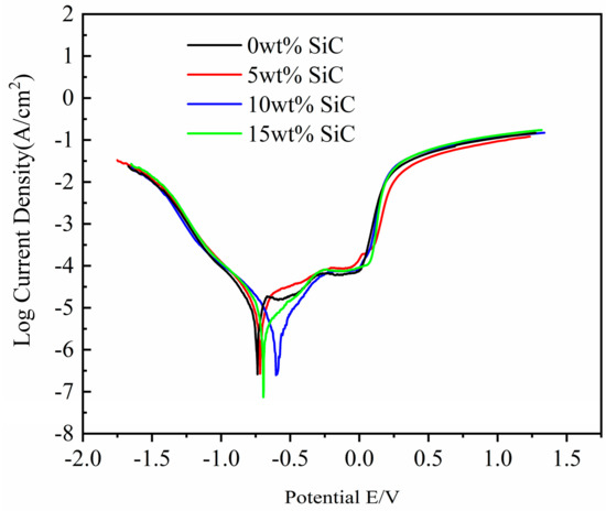 Electrochemical behavior of CoCrFeNiCu(SiC)x HEA coating was assessed using linear polarization in 3.5% NaCl solution at ambient temperatures. Figure 7 shows the linear polarization curves generated from measurements. As can be seen, all of the samples exhibit passive anodic regions (stable current at the potential ranging from −0.25 to 0 V), which indicates the formation of passive films on each coating surface during the process of electrochemical corrosion. Thus, electrolyte solutions can be used to retard WE surface corrosion. When SiC is added to the coating, the defects of the coating are reduced, and the corrosion resistance of the coating is improved. However, when the SiC content increased to 15 wt%, the peak of Cr7C3 in XRD was more obvious. It shows that the increase of Cr7C3 leads to the existence of chromium-depleted regions in the grains, the formation of potential difference with the grain boundaries, and the change of the properties of the passivation film. As a result, intergranular corrosion is stimulated, especially in chloride environments, resulting in a decrease in the corrosion resistance of the coating. Table 2 shows the electrochemical parameters of the four CoCrFeNiCu(SiC)x coatings after the polarization test. The free corrosion potential (Ecorr) and free corrosion density (Icorr) of the CoCrFeNiCu(SiC)x coatings both show a degree of regularity. According to electrochemical theory, Ecorr follows the thermodynamic trend of the corrosion of the WE, while Icorr corresponds to the dissolution of the WE. Both Ecorr and Icorr can be calculated via Tafel extrapolation based on the degree of linearity in the polarization curve. The optimal corrosion resistance occurs when the lowest corrosion current density is seen for the highest potential [32,33]. The observed trends in Ecorr and Icorr point to the superior corrosion resistance of the SiC-modified HEA compared with the unmodified HEA. Comparing the corrosion resistance of four CoCrFeNiCu(SiC)x coatings, with the increase of SiC content, Icorr and corrosion rate first decreased and then increased. It shows that adding SiC in a certain range can improve the corrosion resistance of CoCrFeNiCu(SiC)x HEA coating. However, with the increase of SiC content, the corrosion resistance of the coating decreases. The Icorr of CoCrFeNiCu and CoCrFeNiCu(SiC)5 coatings are both in the order of 10−2, while the Icorr of the CoCrFeNiCu(SiC)10 coating is reduced to the order of 10−3, and the Icorr of the CoCrFeNiCu(SiC)15 coating is increased to the order of 10−2. It shows that when the SiC content reaches 10 wt%, the corrosion resistance of CoCrFeNiCu(SiC)x HEA coating is significantly improved.