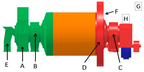 Paintings were made on the casing of the ball mill in six places characterized by different vibration parameters (A, B, C, D, E, F; Figure 1 and Figure 2). Additionally, a set of 15 cm × 8 cm × 0.3 cm test coating samples (G, H; Figure 1, Figure 3, Figure 4 and Figure 5) was attached to the body of the mill (Figure 4) and near the mill, but without the presence of vibrations (Figure 5). As the samples were prepared outside the hall, albeit similarly, it was easier to obtain better substrate preparation (e.g., by lower atmospheric humidity and less possibility of contamination of the substrate in the period between cleaning the surface and applying the coating).