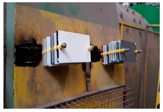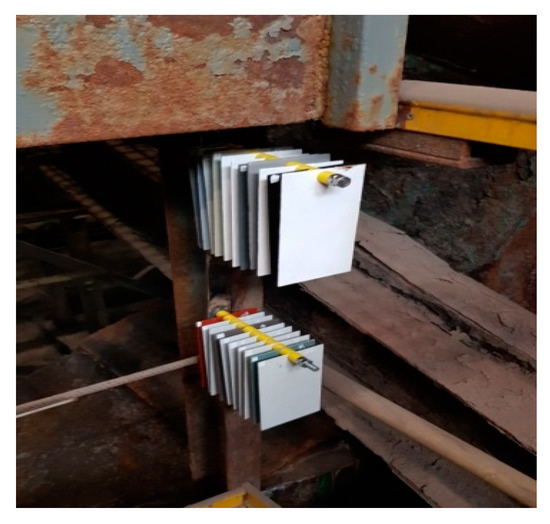 The hall has a stable, elevated temperature concerning the ambient temperature; the relative air humidity is about 90%. Most of the surface is wetted with mine water containing 30 to 120 g/dm3 of salt, mainly chlorides and sulphates, and dump copper ore dust. Additionally, there are present compounds added to the feed to facilitate the flotation process (collectors: ethyl and iso-butyl xanthates; frothers: a mixture of polyglycols and polyglycol ethers) [23]. Most of the devices used in the hall are subject to vibration and abrasion [24]. Earlier, the corrosivity of the atmosphere was examined by measuring the rate of corrosion loss of carbon steel plates in accordance with the EN ISO 12944-2 (2018) standard (European standard, EN ISO 12944-2 Paints and varnishes—Corrosion protection of steel structures by protective paint systems—Part 2: Classification of environments). The steel corrosion rate in these conditions was in the range of 39–222 µm/year. The range of medium to extreme corrosivity categories according to EN ISO 12944-2 occurs in the hall where the tests were carried out.