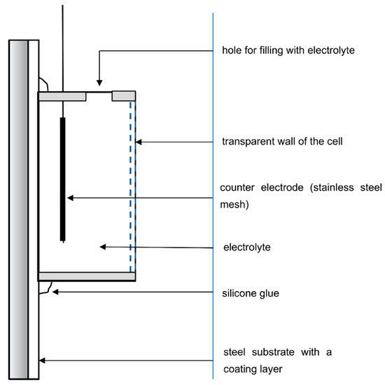 After this period, the samples were tested by employing impedance spectroscopy (to obtain coating resistance). Impedance tests were performed on the coating samples and paintings on the mill casting. The measuring cells (Figure 2 and Figure 3) were glued to the surface and filled with a 3% NaCl solution and after about 24 h immersion (to stabilize the condition of the coatings) impedance tests were performed. Figure 6 shows a schematic view of the measuring cell glued to the coated surface. The transparent cell wall is used to check the electrolyte level in the measuring cell.