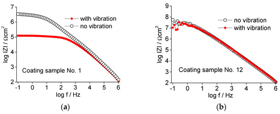 Exemplary spectra in Bode format (modulus) for samples No. 1 (a) and 12 (b) exposed for one year in the absence and presence of vibrations.