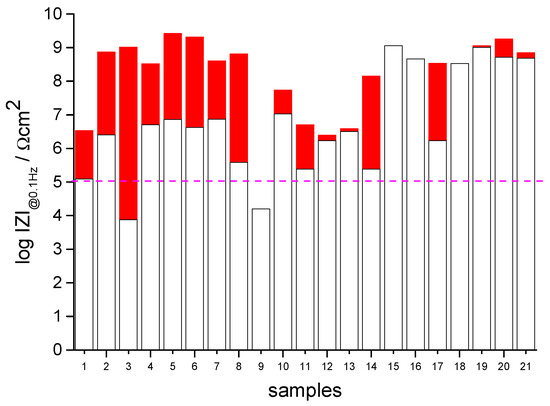 The logarithm of the impedance modulus log|Z| at 0.1 Hz for 21 samples exposed to the mill housing (white) in the presence of vibration and adjacent to the exposure without vibration (red) after one year of exposure.