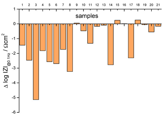 Differences in the value of the impedance modulus log|Z| at 0.1 Hz for samples exposed without and with the presence of vibrations after one year of exposure.