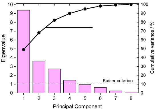 PCA was applied and eight principal components (PCs) were extracted. The percentages of the variances explained by each PC were 49.021%, 18.921%, 14.27%, 7.617%, 5.048%, 3.299%, 1.263%, and 0.560%, respectively. Figure 10 shows the cumulative variance of the eight principal components. Clearly, the percentage of the first two PCs describe 67.942% and the first three as being 82.212% of the total information reflected by the eight parameters. If applying the Kaiser criterion (a single component should be greater than one [30]), the first four components should be retained.