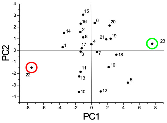 PCA score plot for the first two components, PC1 and PC2. Two virtual coating systems with the best (23) and worst (22) protective properties are marked.