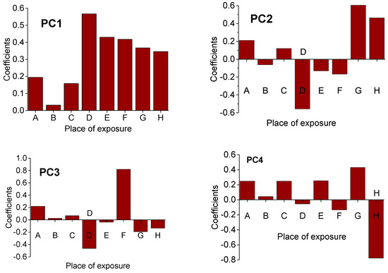 To identify the impact of vibrations on the protective properties of the coatings, loadings were analyzed to find those in which the vibrated and non-vibrated samples would differ in opposite directions (Figure 13). We find this for PC4. Hence, it can be estimated that under the tested conditions, the contribution of vibrations to the degradation of coatings can be estimated to be at 8% (Figure 10). Earlier loadings most likely relate to the parameters of the chemical composition and the physical parameters of the environment (probably PC1 and PC2), and the abrasive effect of the copper ore on the coating (probably PC3).