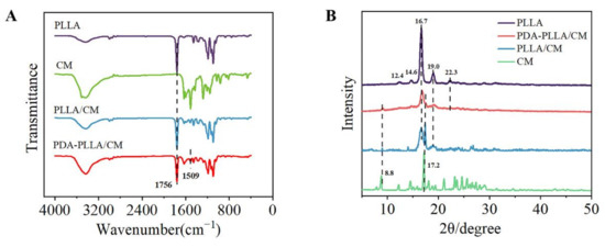 (A) FTIR spectra, (B) XRD patterns of PLLA, CM, PLLA/CM and PDA-PLLA/CM microparticles.