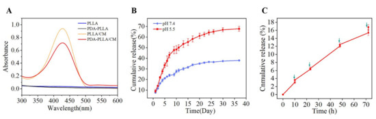 As shown in Figure 3A, the UV absorption spectral of the samples was used to calculate the drug loading efficiency (DLE) of PLLA/CM, PDA-PLLA/CM microparticles. PLLA and PDA-PLLA microparticles had no obvious characteristic peaks within the detection range of 300–600 nm. After the CM loading process, a characteristic absorption peak appeared at 425 nm in the spectral of PLLA/CM and PDA-PLLA/CM microparticles, proving that CM was successfully loaded on the microparticles. The CM loading rates was 15.6% calculated by the standard curve of CM and corresponding formula for the quantitative analysis.
