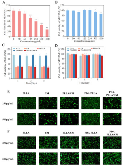 (A,B) Cell viability after being co-cultured with PDA-PLLA/CM microparticles at different concentrations for 48 h. (C,D) After being treated with different samples for 1, 3, 5 days. (E,F) Fluorescence staining images of MG-63 and MC3T3-E1 cells incubation with different samples. (PLLA, PLLA/CM, PDA-PLLA and PDA-PLLA/CM microparticles, 500 μg/mL; CM, 75 μg/mL). (* p-value < 0.05, *** p-value < 0.001).