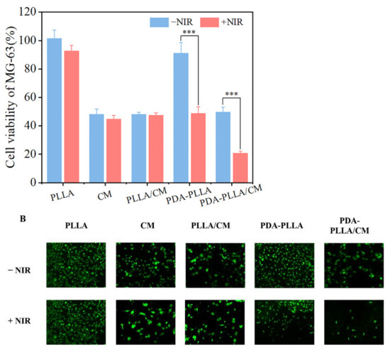 (A) Cell viability ofMG-63 cells after being cultured with PLLA, PLLA/CM, PDA-PLLA and PDA-PLLA/CM microparticles at the same CM concentration level with or without NIR irradiation (PLLA, PLLA/CM, PDA-PLLA and PDA-PLLA/CM microparticles, 500 μg/mL; CM, 75 μg/mL). (B) Fluorescence staining images of MG-63 cells with or without NIR irradiation (1.3 W/cm2) for 10 min. (*** p-value < 0.001).