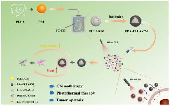Recently, photothermal therapy (PTT) has attracted wide attention due to its advantages of low side effects, repeatable treatment, short treatment time, and obvious effects [42]. PTT is a minimally invasive treatment that converts light energy into heat energy under the irradiation of an external light source such as near infrared (NIR) light, raising the temperature of the illuminated area to an effective therapeutic temperature to achieve thermal ablation of tumors [43]. In the process of PTT, the temperature of the local tumor is the key to photothermal therapy. To achieve the ideal effect of photothermal therapy, the local temperature of tumor usually is required to reach about 45 °C to cause the heat injury of tumor cells and no damage to nearby normal tissue [44]. PTT cannot only cause death in cancer cells directly through raising the temperature, but also accelerate the release of drugs, playing a synergistic therapeutic effect. Therefore, the development of photothermal transducing agent with high Photothermal conversion rate, good water solubility and good biocompatibility has become the focus of research [42,45]. Polydopamine (PDA) is a biocompatible and biodegradable photothermal material, attracting extensive attention in the field of biomedical materials [46]. Compared with other photothermal transducing agents, PDA has higher photothermal conversion rate, good cell affinity and tissue adhesion, having a great prospect in the photothermal treatment of cancer [47]. A large amount of research has reported that PDA has been widely used as an efficient photothermal transducing agent and drug nanocarrier in PTT to improve anti-cancer efficacy [13,19,20,21]. PDA was used as a coating material to give some drug carriers the potential for photothermal therapy, protect the drug from premature release, and avoid rapid elimination from the body. PDA could be deposited on the surfaces of materials of various types and shapes by self-polymerization of dopamine under slightly alkaline conditions, such as nanosheets, nanoparticles and other materials [19,48]. Researchers have also reported that PDA was able to coat many drug-loaded microspheres, including CM-loaded microspheres [12,48]. However, studies using PDA-coated drug-loaded PLLA microparticles for the photothermal treatment of osteosarcoma have seldom been performed.