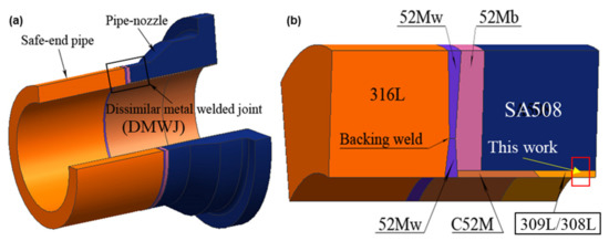 Schematic diagram of the pipe–nozzle, safe-end pipe, and DMWJ (a); and the position of the investigated dissimilar metal cladding (b) [18].