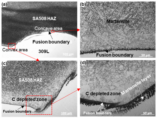 It is obvious that the microstructure of the SA508 side was not uniform along the fusion boundary, as the heat flux was not homogeneous for every bead or for multi-bead welding (Figure 4a). Overall, a light layer of carbon depletion in the HAZ just adjacent to the fusion boundary was found, although its width was not uniform, which was caused by carbon diffusion from SA508 to 309L. The microstructure of the concave area near the fusion boundary was coarse martensite (Figure 4b), and the average width of the carbon-depleted zone in this area was about 80 μm. A thin dark layer was observed along the fusion boundary, which was shown to be martensite in Reference [4]. In addition, carbides were found at this area, formed by the reaction of the migrated carbon from SA508 with the chromium in 309L. The microstructure of the convex area is shown in Figure 4c,d, where ferrite was the main structure in the carbon-depleted zone. Furthermore, the carbon-depleted zone in this area was larger, at an average width of about 120 μm, and more obvious than the zone in the concave area. This kind of phenomenon had also been observed in our previous study [1]. Carbon migration is related to the temperature and the high-temperature duration of the welding process [11]. The convex area was double-heated during the multi-bead welding process, and its interface for carbon migration was longer, which promoted carbon migration during welding. A martensite layer was also found in this area, and its thickness was also greater than the layer in the concave area, as its formation was linked to the more pronounced carbon migration in the convex area.