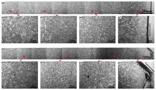 OM microstructure transition in the SA508 HAZ: (a) image at a low magnification of the HAZ at the concave area; (a1–a4) local images with higher magnification of (a); (b) image at a low magnification of the HAZ at the convex area; (b1–b4) local images at higher magnification of (b).