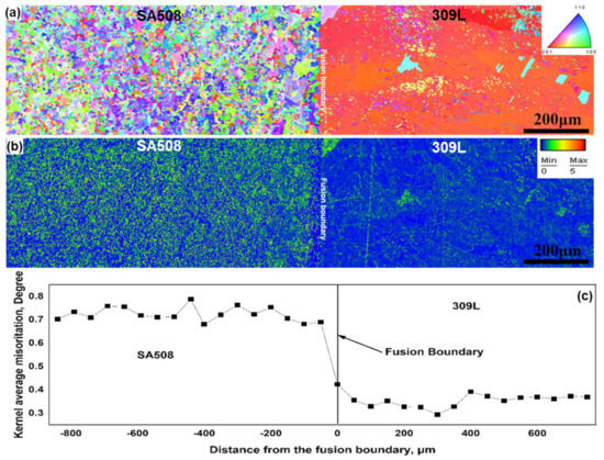EBSD results of SA508–309L fusion boundary: (a) inverse pole figure (IPF); (b) kernel average misorientation (KAM) distribution map; and (c) the KAM value apart from the fusion boundary.