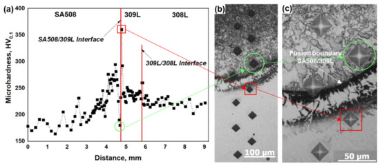 The micro-hardness distribution from the SA508 base metal to the 309L cladding layer and then to the 308L layers is shown in Figure 9a, and the images of the indentations at the SA508–309L interface area are shown in Figure 9b,c, as there was a dramatic change in micro-hardness at the interface area.