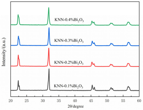 XRD pattern of KNN-xBi2O3 piezoelectric ceramics.